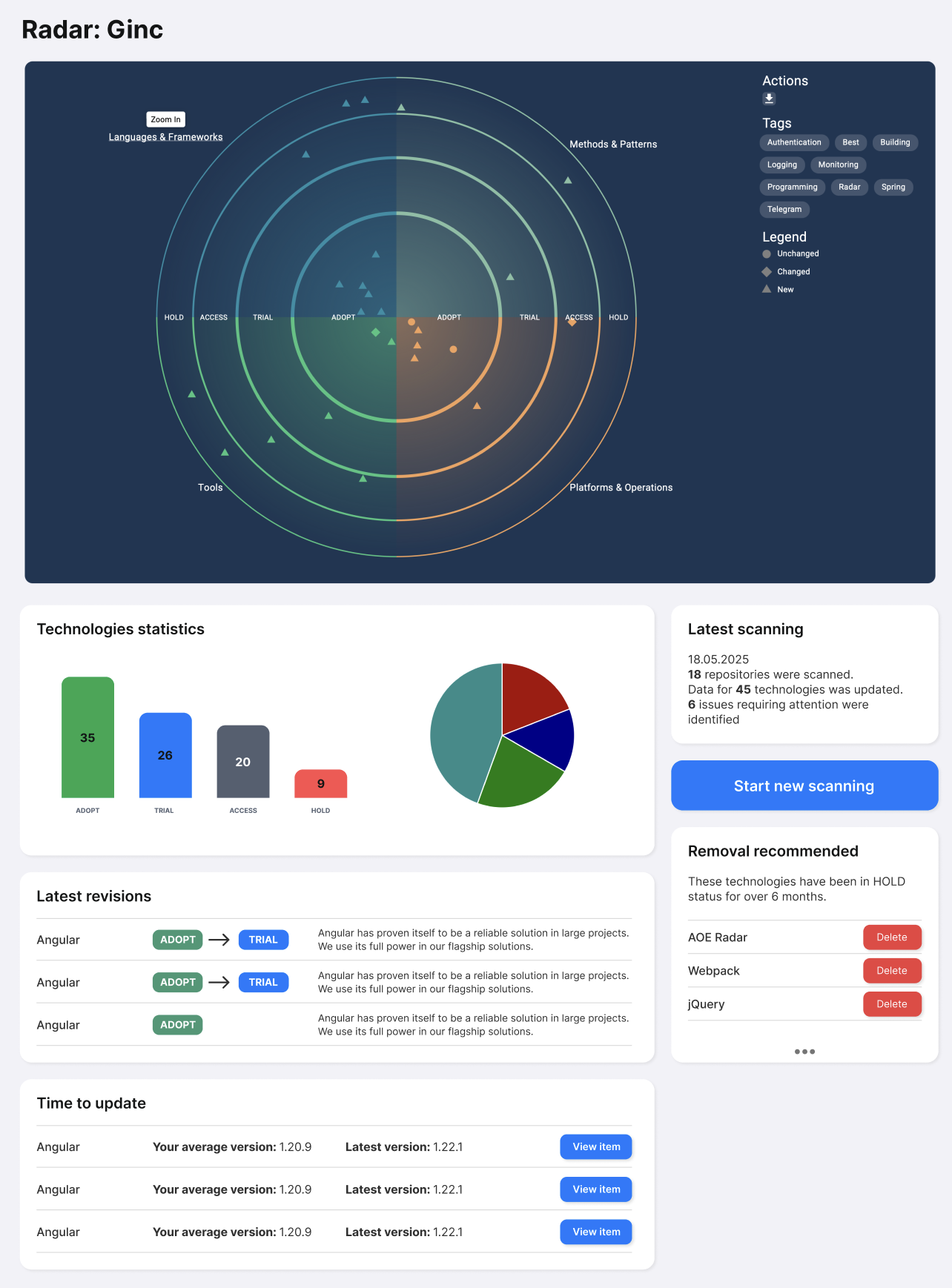 Ginc Radar автоматизирует аудит IT-инфраструктуры, визуализирует технологический стек на интерактивном техрадаре и помогает компаниям повысить прозрачность, безопасность и эффективность разработки.