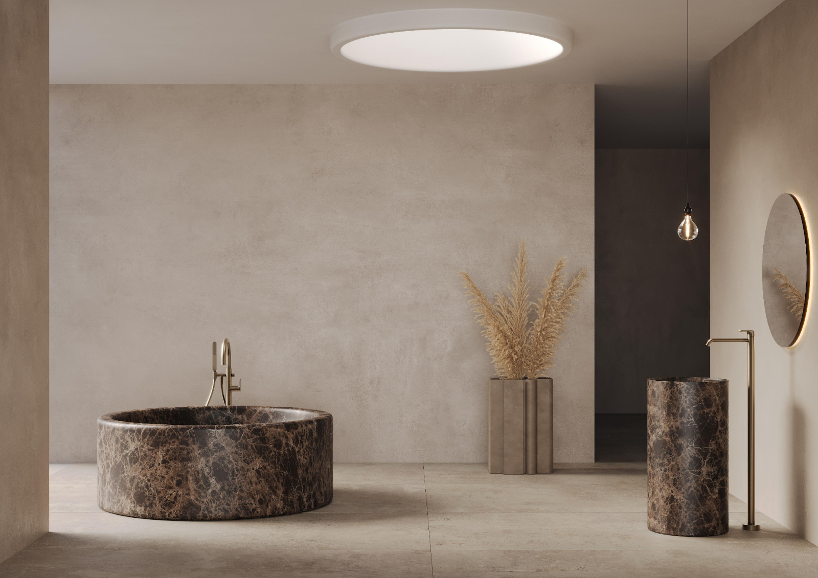 Ванные комнаты в природных тонах, таких как терракотовый, бежевый, коричневый, золотистый, серо-гранитный, оливковый и коричневато-серый, создают уютную и спокойную атмосферу. Нежные зеленые (мятный, фисташковый и оливковый) оттенки создают расслабляющую атмосферу и сочетаются с различными материалами.